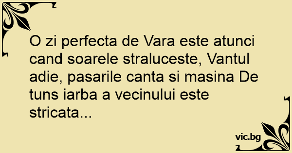 O zi perfecta de Vara este atunci cand soarele straluceste, Vantul adie, pasarile canta si masina De tuns iarba a vecinului este stricata...