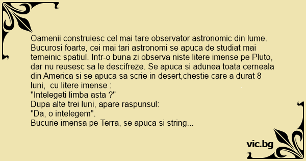 Oamenii construiesc cel mai tare observator astronomic din lume. Bucurosi foarte, cei mai tari astronomi se apuca de studiat mai temeinic spatiul. Intr-o buna zi observa niste litere imense pe Pluto, dar nu reusesc sa le descifreze. Se apuca si adunea toata cerneala din America si se apuca sa scrie in desert,chestie care a durat 8 luni, cu litere imense :