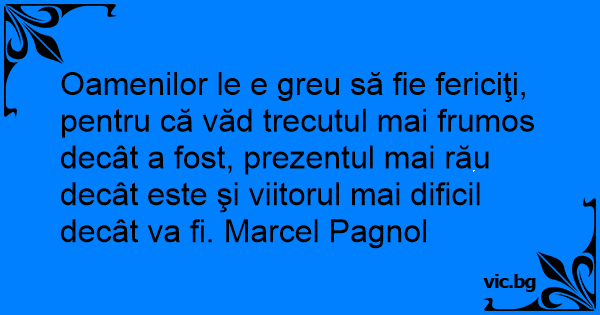 Oamenilor le e greu să fie fericiţi, pentru că văd trecutul mai frumos decât a fost, prezentul mai rău decât este şi viitorul mai dificil decât va fi. Marcel Pagnol