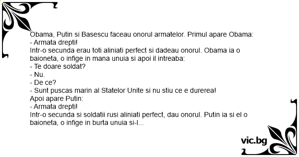 - Armata drepti. Un biban ia repede o creta, trage o dunga si se aliniaza cu chiu cu vai toti la dunga. Basescu ia o baioneta, o infige in piciorul unui soldat si-l intreaba: