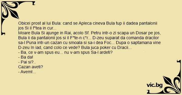 Moare Bula Si ajunge in Rai, acolo Sf. Petru intr-o zi scapa un Dosar pe jos, Bula ii da pantalonii jos si il F*te-n c*r... D-zeu suparat da comanda dracilor sa-l Puna intr-un cazan cu smoala si sa-i dea Foc... Dupa o saptamana vine D-zeu In iad, cand colo ce vede? Bula juca poker cu Dracii...