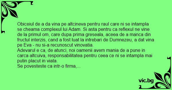 Adevarul e ca, de atunci, noi oamenii avem mania de a pune in carca altcuiva, responsabilitatea pentru ceea ce ni se intampla mai putin placut in viata.