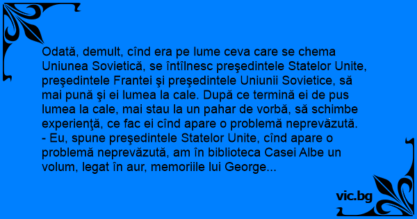 Odată, demult, cînd era pe lume ceva care se chema Uniunea Sovietică, se întîlnesc preşedintele Statelor Unite, preşedintele Frantei şi preşedintele Uniunii Sovietice, să mai pună şi ei lumea la cale. După ce termină ei de pus lumea la cale, mai stau la un pahar de vorbă, să schimbe experienţă, ce fac ei cînd apare o problemă neprevăzută.