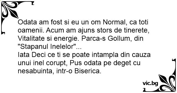 Odata am fost si eu un om Normal, ca toti oamenii. Acum am ajuns stors de tinerete, Vitalitate si energie. Parca-s Gollum, din "Stapanul Inelelor"...