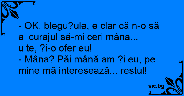 - OK, blegu?ule, e clar că n-o să ai curajul să-mi ceri mâna... uite, ?i-o ofer eu!