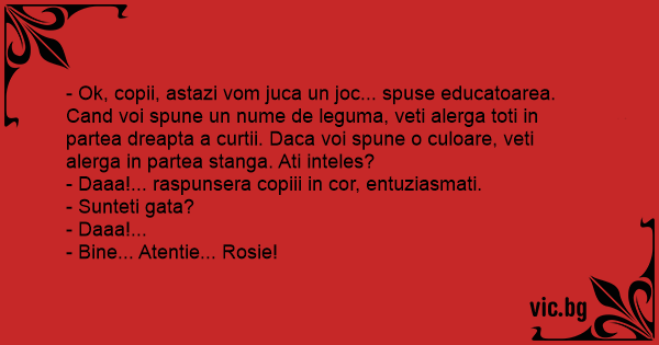 - Ok, copii, astazi vom juca un joc... spuse educatoarea. Cand voi spune un nume de leguma, veti alerga toti in partea dreapta a curtii. Daca voi spune o culoare, veti alerga in partea stanga. Ati inteles?