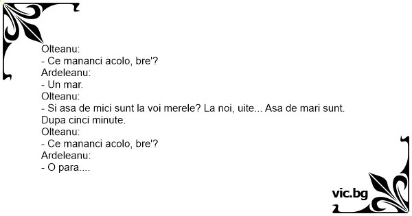 - Si, la voi, asa de mici sunt perele? La noi uite... Asa de mari sunt. Ardeleanu is da seama ca e luat peste picior da' tace si nu zice nimic.
