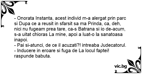 - Onorata Instanta, acest individ m-a alergat prin parc si Dupa ce a reusit in sfarsit sa ma Prinda, ca, deh, nici nu fugeam prea tare, ca-s Batrana si io de-acum, s-a uitat chioras La mine, apoi a luat-o la sanatoasa inapoi.