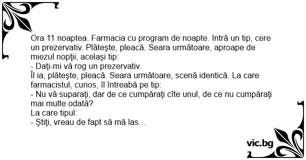 Ora 11 noaptea. Farmacia cu program de noapte. Intră un tip, cere un prezervativ. Plăteşte, pleacă. Seara următoare, aproape de miezul nopţii, acelaşi tip: