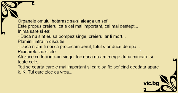 Се собрале сите човечки органи да решат кој е најважен. Мозокот прв се јавил. - Јас сум најважен, без мене ништо нема да функционира како треба. Се јавил стомакот: - Е исто е и кај мене, јас ако не...