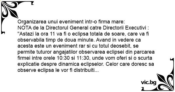 "Astazi la ora 11 va fi o eclipsa totala de soare, care va fi observabila timp de doua minute. Avand in vedere ca acesta este un eveniment rar si cu totul deosebit, se permite tuturor angajatilor observarea eclipsei din parcarea firmei intre orele 10:30 si 11:30, unde vom oferi si o scurta explicatie despre dinamica eclipselor. Celor care doresc sa observe eclipsa le vor fi distribuiti ochelari de protectie, la un pret minim."