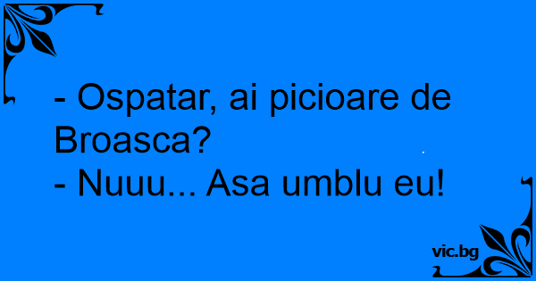 La un restaurant, un client Intreaba ospatarul: - Ai picioare de Broasca? - Nu, asa merg eu mai cracanat. Altceva?