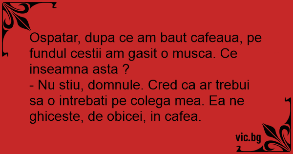 - Nu stiu, domnule. Cred ca ar trebui sa o intrebati pe colega mea. Ea ne ghiceste, de obicei, in cafea.