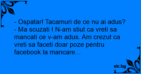 - Ma scuzati ! N-am stiut ca vreti sa mancati ce v-am adus. Am crezut ca vreti sa faceti doar poze pentru facebook la mancare...