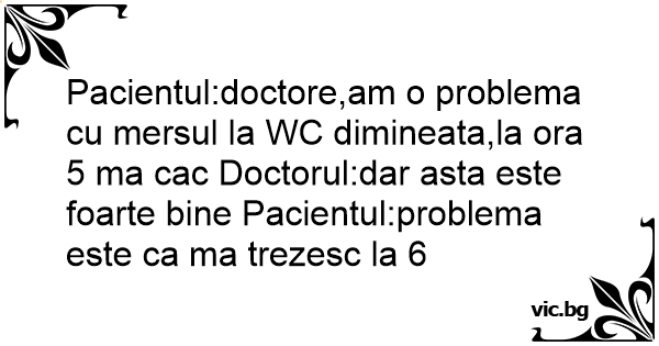 Pacientul:doctore,am o problema cu mersul la WC dimineata,la ora 5 ma cac Doctorul:dar asta este foarte bine Pacientul:problema este ca ma trezesc la 6