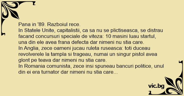 In Statele Unite, capitalistii, ca sa nu se plictiseasca, se distrau facand concursuri speciale de viteza: 10 masini luau startul, una din ele avea frana defecta dar nimeni nu stia care.