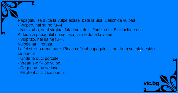 - Hai sa ne fu--- - Bine. Intra porcul si o fu-- pe vulpe MORALA: Degeaba еsтi papagal, ca sa fu-- o femeie trebioe sa fii porc.