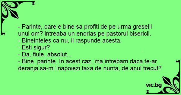 - Parinte, oare e bine sa profiti de pe urma greselii unui om? intreaba un enorias pe pastorul bisericii.
