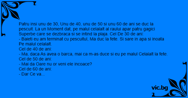 Patru insi unu de 30, Unu de 40, unu de 50 si unu 60 de ani se duc la pescuit. La un Moment dat, pe malul celalalt al raului apar patru gagici Superbe care se dezbraca si se intind la plaja. Cel De 30 de ani: