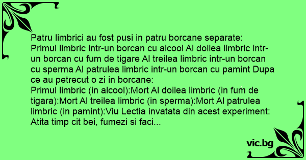Primul limbric (in alcool):Mort Al doilea limbric (in fum de tigara):Mort Al treilea limbric (in sperma):Mort Al patrulea limbric (in pamint):Viu Lectia invatata din acest experiment: