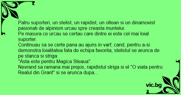 Continuau sa se certe pana au ajuns in varf, cand, pentru a-si demonstra loialitatea fata de echipa favorita, stelistul se arunca de pe stanca si striga: