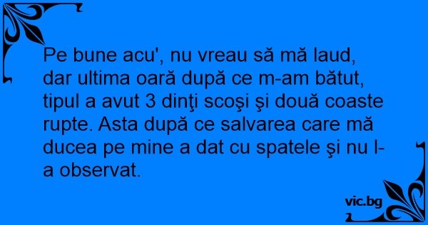Pe bune acu', nu vreau să mă laud, dar ultima oară după ce m-am bătut, tipul a avut 3 dinţi scoşi şi două coaste rupte. Asta după ce salvarea care mă ducea pe mine a dat cu spatele şi nu l-a observat.