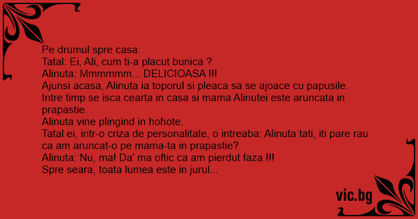 Tatal ei, intr-o criza de personalitate, o intreaba: Alinuta tati, iti pare rau ca am aruncat-o pe mama-ta in prapastie?