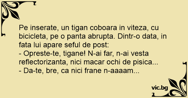 Pe inserate, un tigan coboara in viteza, cu bicicleta, pe o panta abrupta. Dintr-o data, in fata lui apare seful de post: