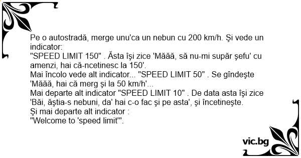 Mai încolo vede alt indicator... "SPEED LIMIT 50" . Se gîndeşte 'Măăă, hai că merg şi la 50 km/h'...