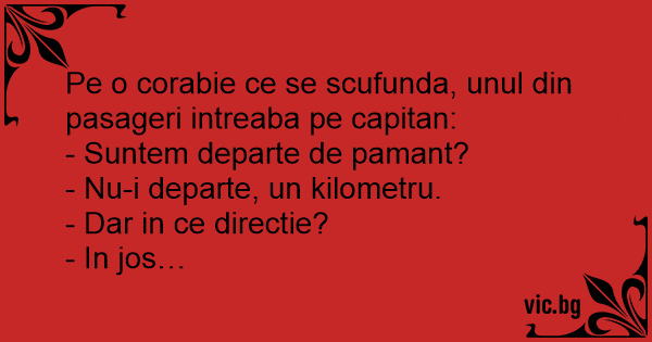 Naufragiaza o corabie. Un pasager se apropie inot de capitan si-l intreaba: - Capitane, cat avem de inotat pana la cel mai apropiat pamant? - Trei kilometri. - In ce directie? - In jos!