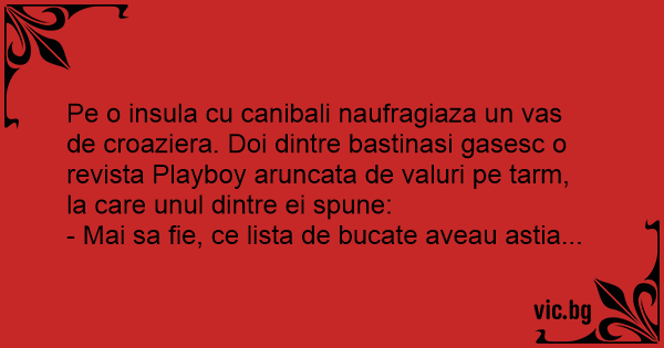 Pe o insula cu canibali naufragiaza un vas de croaziera. Doi dintre bastinasi gasesc o revista Рlаyвоy aruncata de valuri pe tarm, la care unul dintre ei spune: