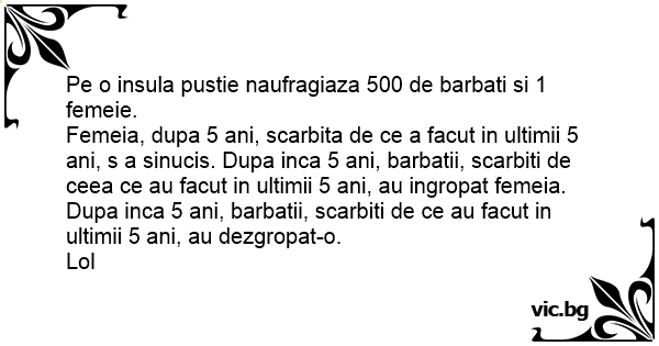 Femeia, dupa 5 ani, scarbita de ce a facut in ultimii 5 ani, s a sinucis. Dupa inca 5 ani, barbatii, scarbiti de ceea ce au facut in ultimii 5 ani, au ingropat femeia. Dupa inca 5 ani, barbatii, scarbiti de ce au facut in ultimii 5 ani, au dezgropat-o.