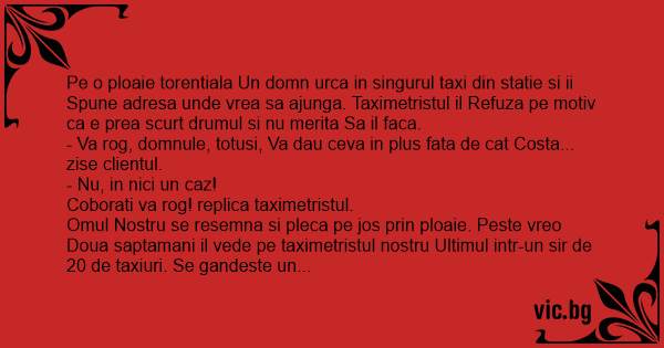 Pe o ploaie torentiala Un domn urca in singurul taxi din statie si ii Spune adresa unde vrea sa ajunga. Taximetristul il Refuza pe motiv ca e prea scurt drumul si nu merita Sa il faca.