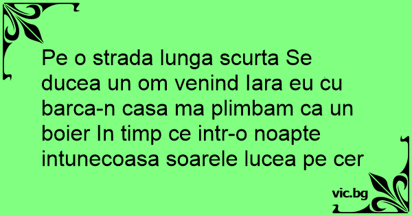 Pe o strada lunga scurta Se ducea un om venind Iara eu cu barca-n casa ma plimbam ca un boier In timp ce intr-o noapte intunecoasa soarele lucea pe cer