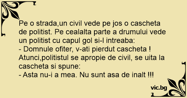 Pe o strada,un civil vede pe jos o cascheta de politist. Pe cealalta parte a drumului vede un politist cu capul gol si-l intreaba: