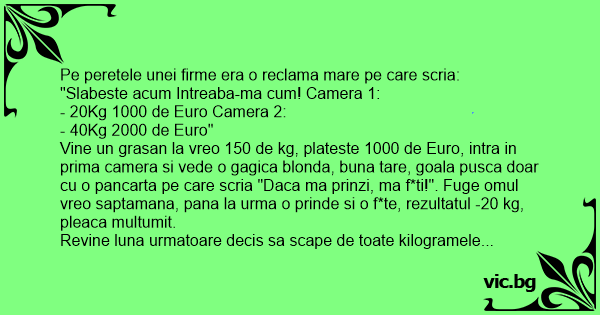 Revine luna urmatoare decis sa scape de toate kilogramele in plus, vrea sa repete tratamentul in camera doi gandindu-se ca il asteapta o roscata focoasa. Plateste 2000 de Euro, intra in camera si surpriza: un negru cu o pancarta "Daca te prind, te f*t!"