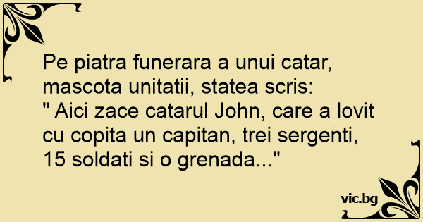 " Aici zace catarul John, care a lovit cu copita un capitan, trei sergenti, 15 soldati si o grenada..."