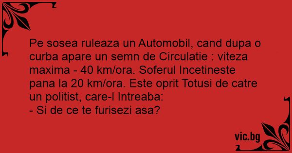 Pe sosea ruleaza un Automobil, cand dupa o curba apare un semn de Circulatie : viteza maxima - 40 km/ora. Soferul Incetineste pana la 20 km/ora. Este oprit Totusi de catre un politist, care-l Intreaba: