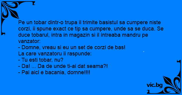 Pe un tobar dintr-o trupa il trimite basistul sa cumpere niste corzi, ii spune exact ce tip sa cumpere, unde sa se duca. Se duce tobarul, intra in magazin si il intreaba mandru pe vanzator: