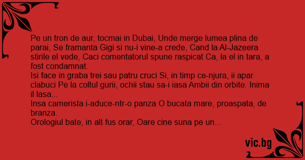 Pe un tron de aur, tocmai in Dubai, Unde merge lumea plina de parai, Se framanta Gigi si nu-i vine-a crede, Cand la Al-Jazeera stirile el vede, Caci comentatorul spune raspicat Ca, la el in tara, a fost condamnat.