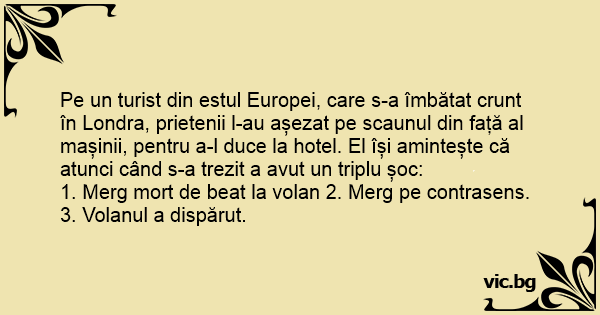 Pe un turist din estul Europei, care s-a îmbătat crunt în Londra, prietenii l-au așezat pe scaunul din față al mașinii, pentru a-l duce la hotel. El își amintește că atunci când s-a trezit a avut un triplu șoc: