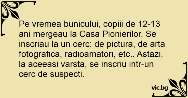 Pe vremea bunicului, copiii de 12-13 ani mergeau la Casa Pionierilor. Se inscriau la un cerc: de pictura, de arta fotografica, radioamatori, etc.. Astazi, la aceeasi varsta, se inscriu intr-un cerc de suspecti.