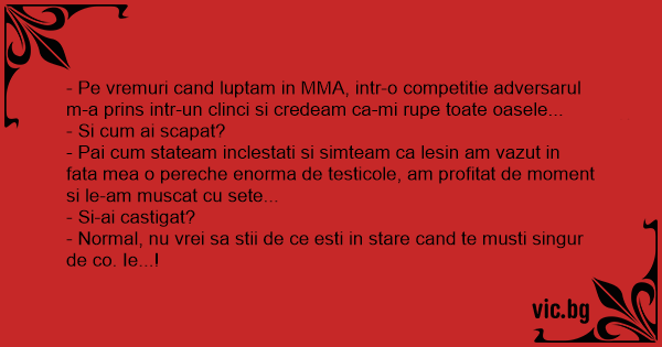 - Pe vremuri cand luptam in MMA, intr-o competitie adversarul m-a prins intr-un clinci si credeam ca-mi rupe toate oasele...