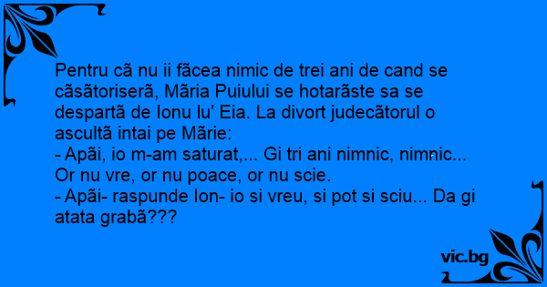 Pentru cã nu ii fãcea nimic de trei ani de cand se cãsãtoriserã, Mãria Puiului se hotarãste sa se despartã de Ionu lu' Eia. La divort judecãtorul o ascultã intai pe Mãrie: