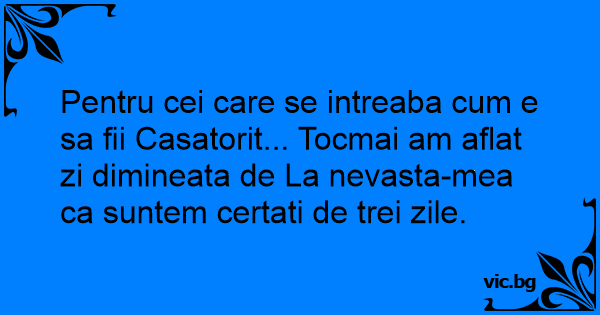 Pentru cei care se intreaba сuм e sa fii Casatorit... Tocmai am aflat zi dimineata de La nevasta-mea ca suntem certati de trei zile.