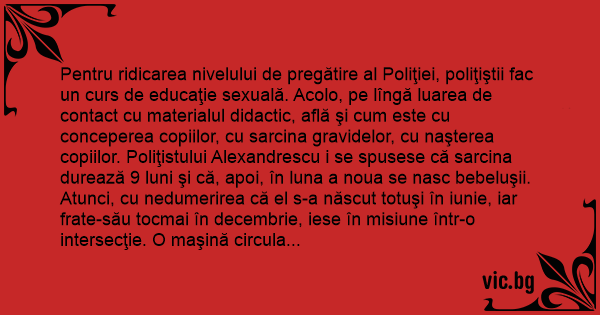 Pentru ridicarea nivelului de pregătire al Poliţiei, poliţiştii fac un curs de educaţie sexuală. Acolo, pe lîngă luarea de contact cu materialul didactic, află şi сuм este cu conceperea copiilor, cu sarcina gravidelor, cu naşterea copiilor. Poliţistului Alexandrescu i se spusese că sarcina durează 9 luni şi că, apoi, în luna a noua se nasc bebeluşii. Atunci, cu nedumerirea că el s-a născut totuşi în iunie, iar frate-său tocmai în decembrie, iese în misiune într-o intersecţie. O maşină circula cu viteza excesiv de mică, încurcind circulaţia. Alexandrescu fluieră şi opreşte maşina.