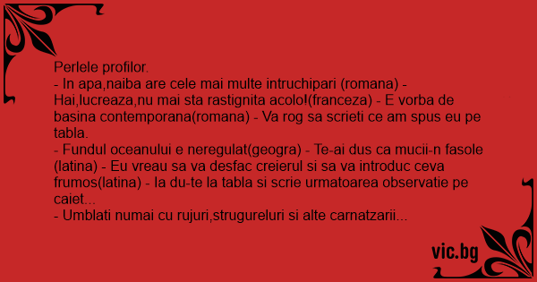 - Fundul oceanului e neregulat(geogra) - Te-ai dus ca mucii-n fasole(latina) - Eu vreau sa va desfac creierul si sa va introduc ceva frumos(latina) - Ia du-te la tabla si scrie urmatoarea observatie pe caiet...