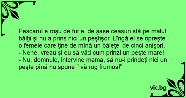 - Nu, domnule, intervine mama, să nu-i prindeţi nici un peşte pînă nu spune " vă rog frumos!"
