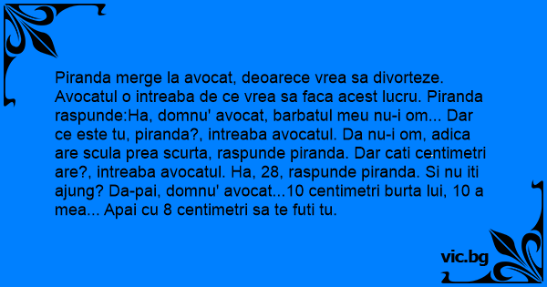 Piranda merge la avocat, deoarece vrea sa divorteze. Avocatul o intreaba de ce vrea sa faca acest lucru. Piranda raspunde:Ha, domnu' avocat, barbatul meu nu-i om... Dar ce este tu, piranda?, intreaba avocatul. Da nu-i om, adica are scula prea scurta, raspunde piranda. Dar cati centimetri are?, intreaba avocatul. Ha, 28, raspunde piranda. Si nu iti ajung? Da-pai, domnu' avocat...10 centimetri burta lui, 10 a mea... Apai cu 8 centimetri sa te futi tu.