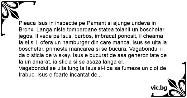 Pleaca Isus in inspectie pe Pamant si ajunge undeva in Bronx. Langa niste tomberoane statea tolanit un boschetar jegos. Il vede pe Isus, barbos, imbracat ponosit, il cheama la el si ii ofera un hamburger din care manca. Isus se uita la boschetar, primeste mancarea si se bucura. Vagabondul ii da o sticla de wiskey. Isus e bucurat de asa generozitate de la un amarat, ia sticla si se asaza langa el.